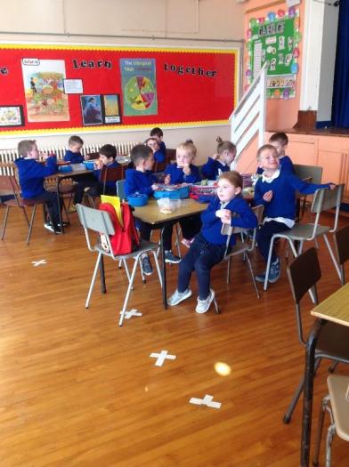 This week in school, P1 enjoyed having lunch and dinner for the very first time! They were the only boys and girls in the halls to allow them time to settle in and get used to their new surroundings. Next week the P1 children will have lunch/dinner at the same time as the rest of the school. They will also begin to stay in school until 2pm!